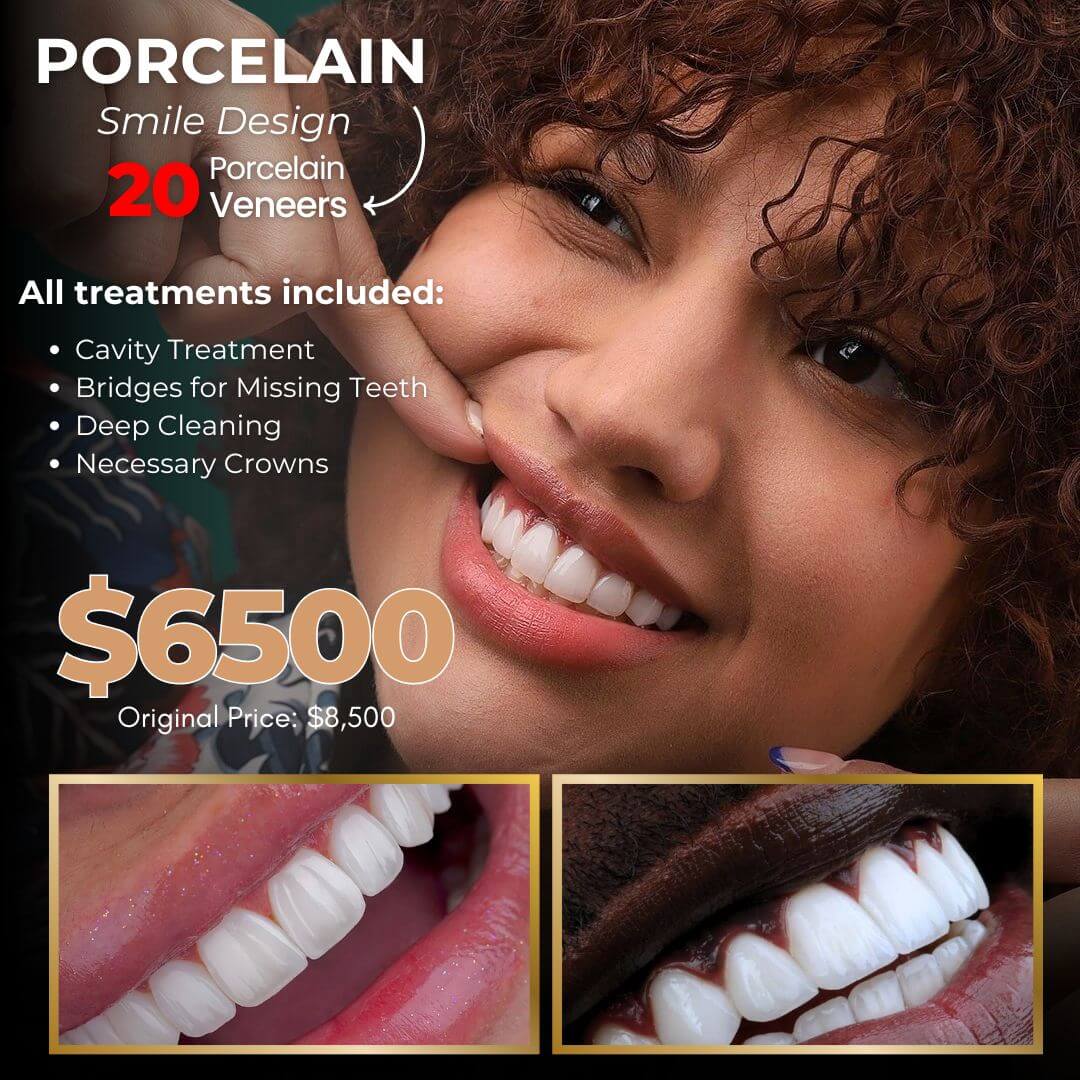Our complete porcelain veneers package at $6,500 includes crowns, bridges, and any required treatments.